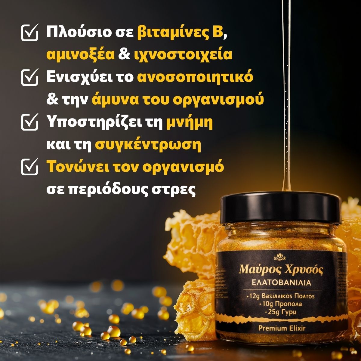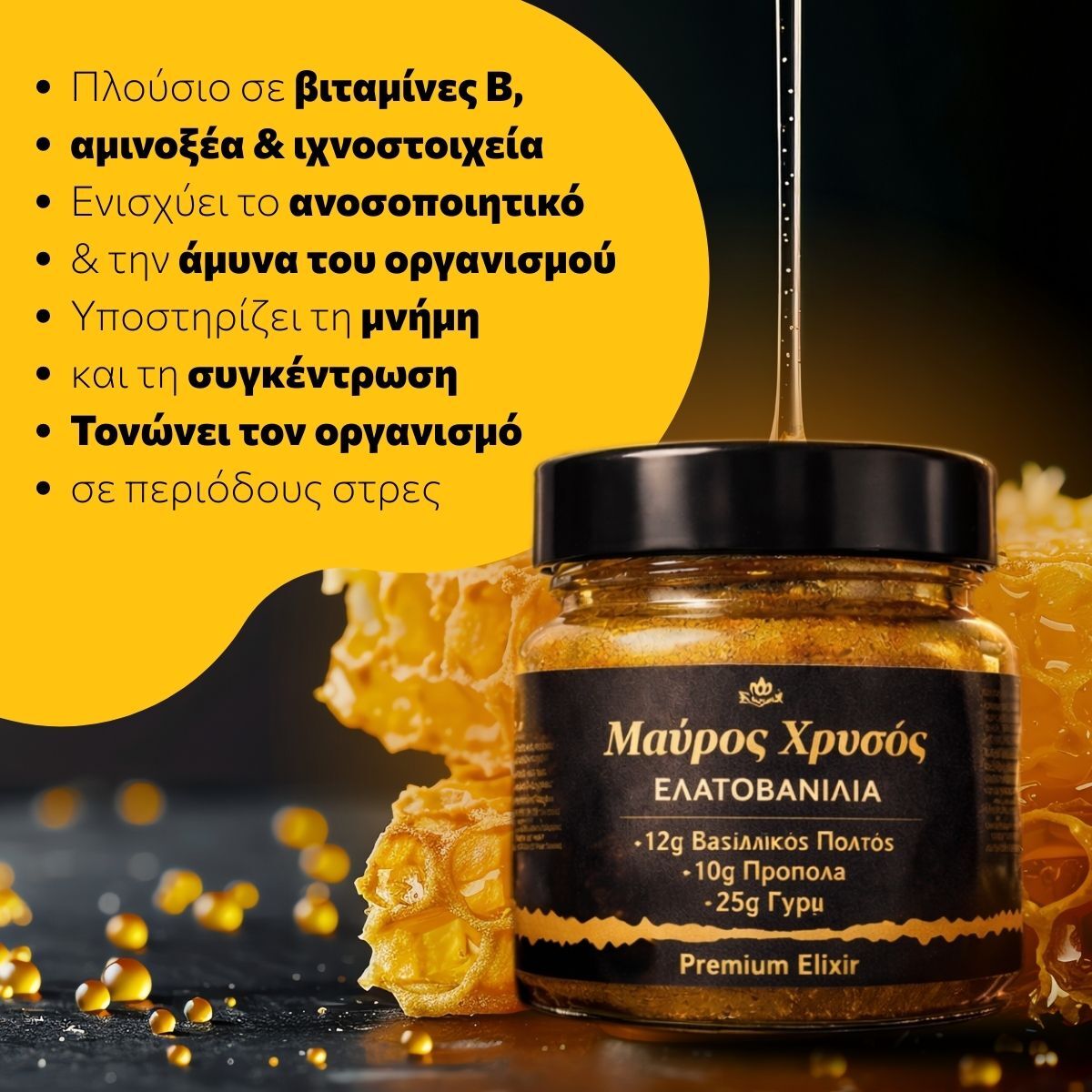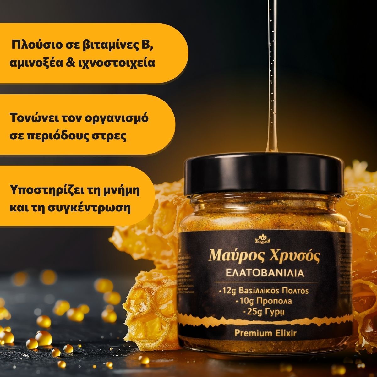 Γιατί είναι μια λειτουργική υπερτροφή. Ενώ το μέλι προσφέρει γεύση, ο Μαύρος Χρυσός προσφέρει θεραπευτικές δόσεις Βασιλικού Πολτού και Πρόπολης που δρουν άμεσα στην ενίσχυση της υγείας σας.
