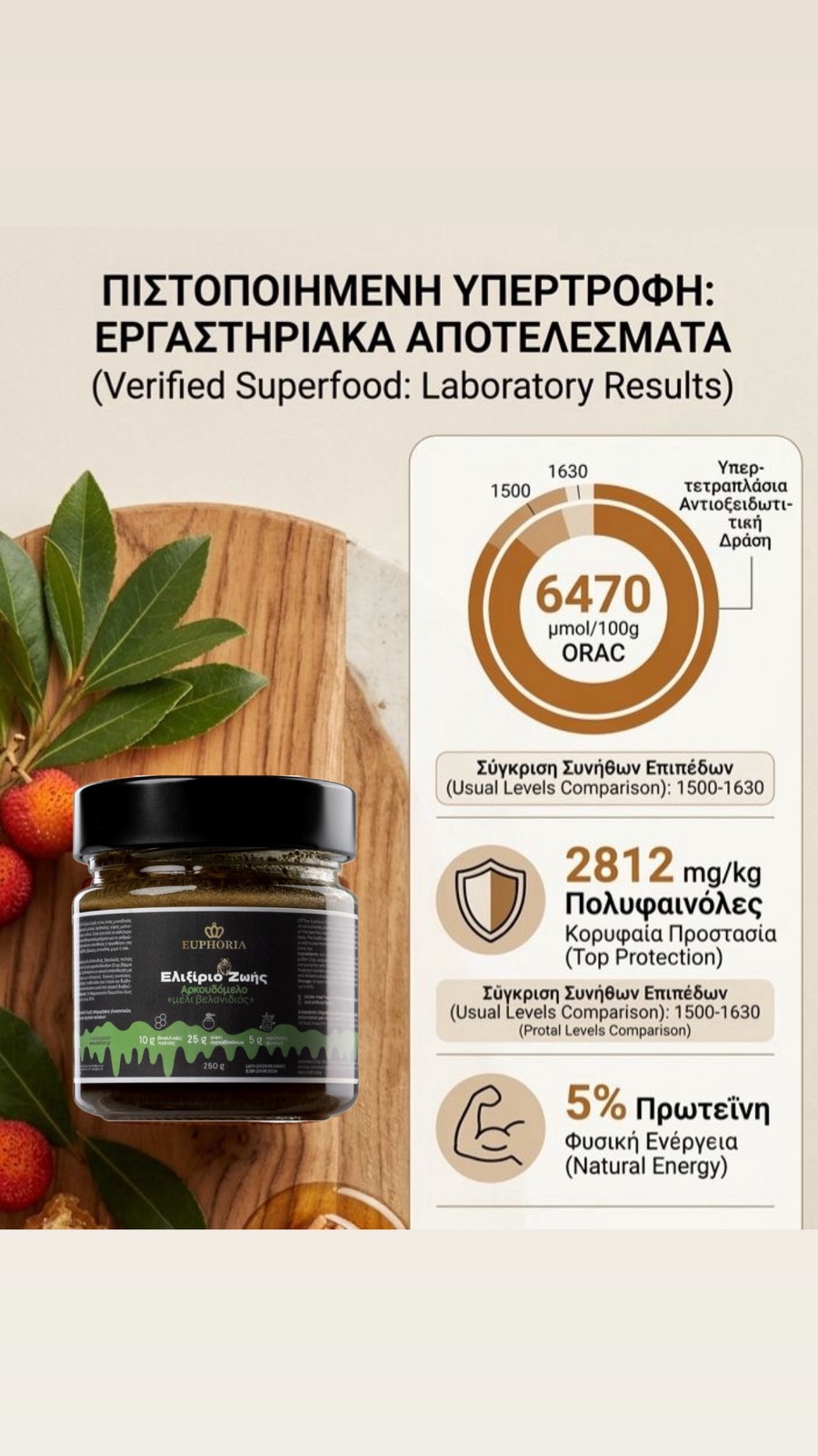 ✔️ Η υψηλότερη αντιοξειδωτική ικανότητα (ORAC) που έχει μετρηθεί σε μέλι.